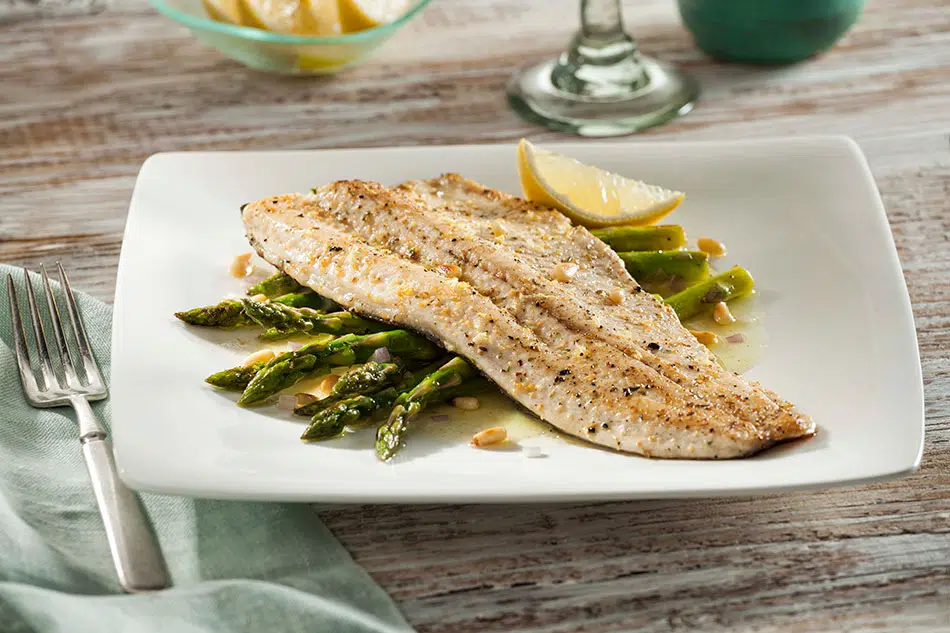 Rainbow Trout with Grilled Asparagus, Toasted Pine Nuts and Lemon-Garlic Vinaigrette